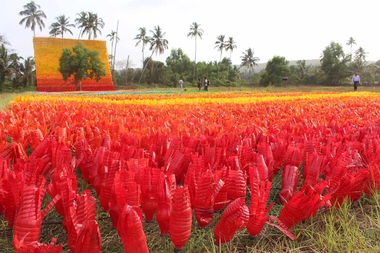 Yellow, red, purple, blue – 1,50,000 discarded plastic bottles, painted colourfully and crafted to look like flowers covered a field of 2,000 square meters and shone in the brightest colours. The installation called “Carpet of Joy”, was put up in the village Saligao in North Goa from April to May 2017.